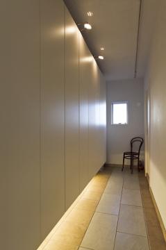 - 東側の壁の幅いっぱい天井際に細長く取り付けた窓から、リビング空間を通り越して外の光が差し込みます。