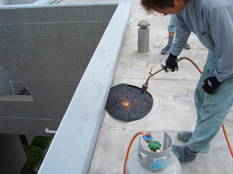 | リフォーム内容 | 新築時にはシート防水でした。シート防水の下には、水溜りがありました。まず屋上全体を点検し、不具合箇所のシート防水をカットして、水を抜き、乾燥、手直しをし、プライマー塗布後、ジェットスプレーによる防水の吹き付け、仕上げにトップコートをローラーで塗りました。2秒で硬化するウレタン防水材は、重ね塗りができ12センチまでの引張強度がございます。防水性、耐久性強度は均一化します。継ぎ目の劣化はございません。 | ||