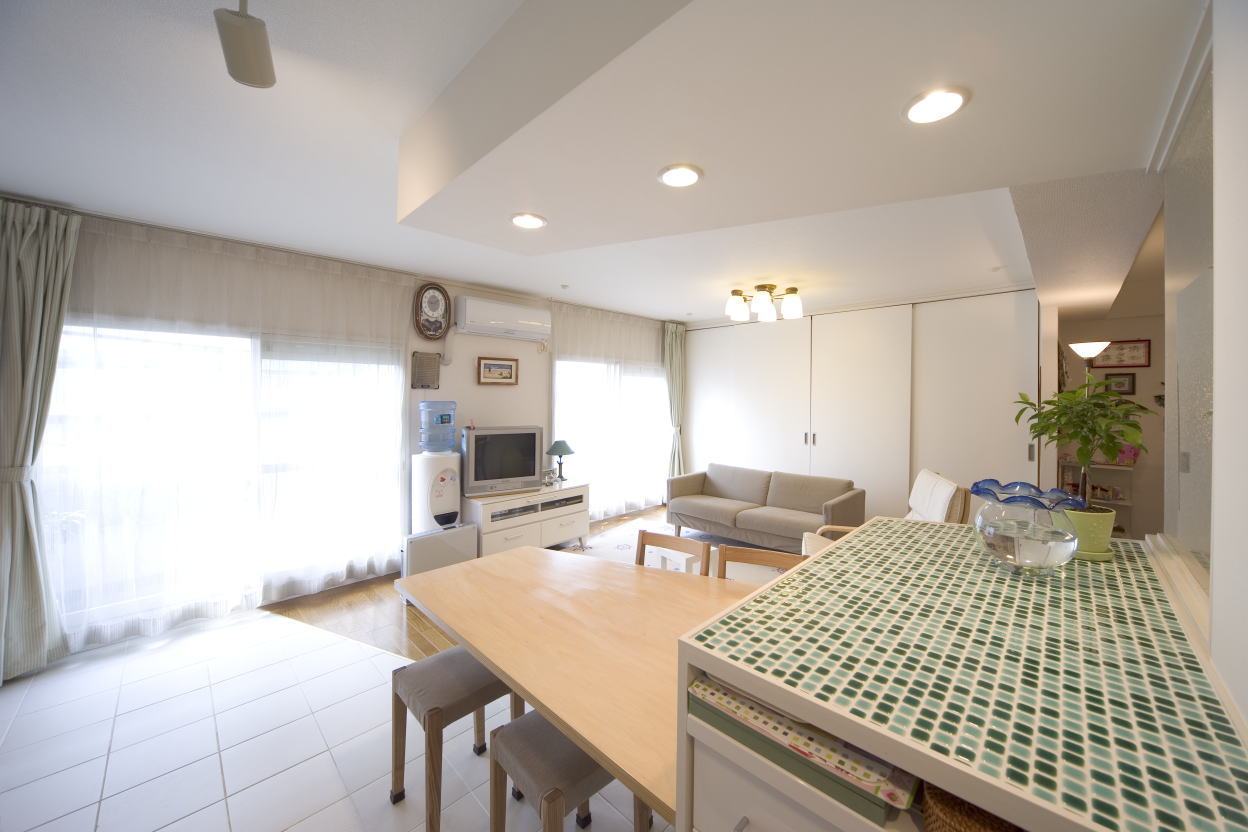 | この事例のこだわり | もともと窓に面して6畳の和室があった標準的な間取りでした。ダイニングとリビングを大胆に斜めに区分けをすることで、窓へむけた広がり感を演出することができました。限られた空間でも間取り、使用する素材、色等で気持ちのいい空間をつくることができます。 | ||