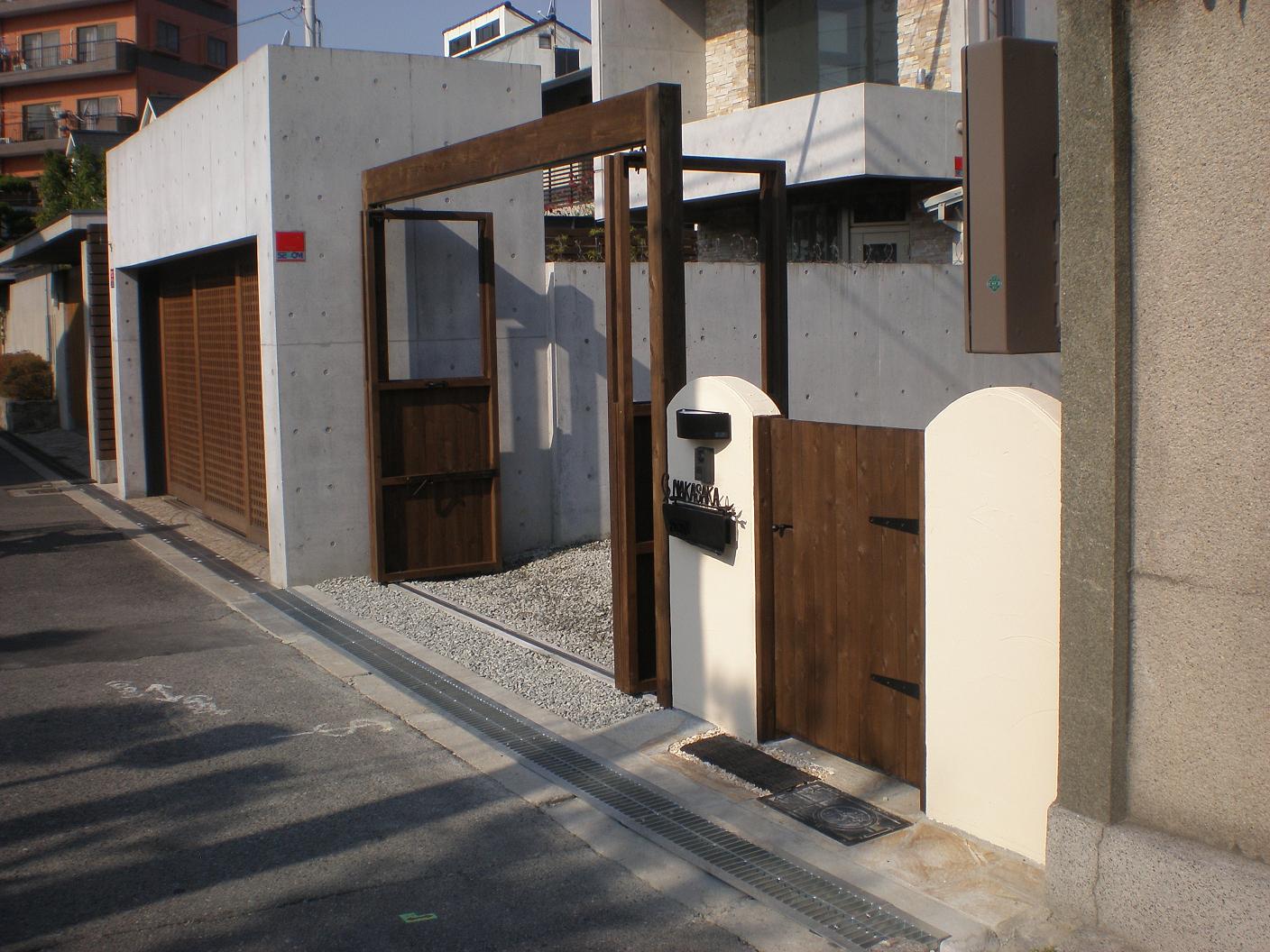 両隣も意識したデザイン。木で作った門扉は味があります。