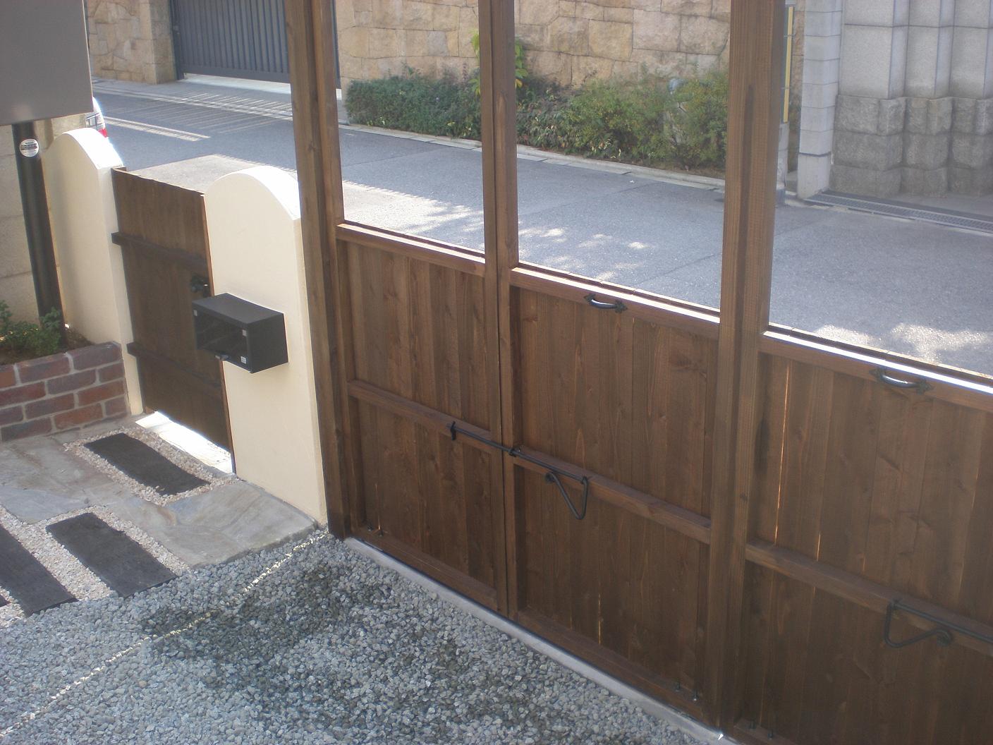 | リフォーム内容 | 防犯もかねているカーゲートと門扉はお客様のご要望で木製でつくっています。 高さのことやデザインのことについては、じっくりと決めていきました。 表札はロートアイアンです。全体のデザインからすると普通の表札ではアンバランスになるので、費用は少々高くつきましたが選択して正解でした。 ガレージはタイヤが乗る部分だけ枕木を採用し、あとは砕石を敷いてコストを落としています。 |