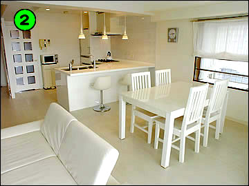 白を基調にすることで、明るいLDKと、全体の統一感を実現しています。開放感のあるオープンカウンターのキッチンで、会話を楽しみながら料理ができます。