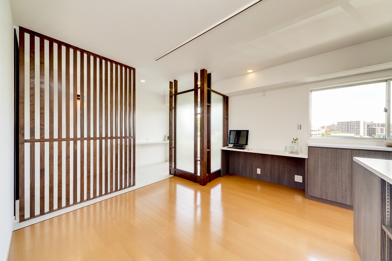 キッチンは使い易くコミュニケーションも取りやすいよう、生活導線をしっかり考えられたプランニングが目を引きます。また、気遣いが隅々まで行き届いているため、築40年という建物の築年数を感じさせません。