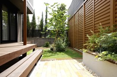 また、目隠しのウッドウォールも木の温もりが感じられます。アプローチには自然石を採用するなど、お庭だから草花を植えるというだけでなく、植える場所を限定することでさっぱりとしたお庭になるのかもしれませんね。ウッドテラスを上手に活用したエクステリアのリフォーム事例です。