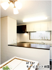 最近はアイランドキッチンなど、開放的なキッチンが流行ですが、このキッチンリフォームでは適度に目隠しがされるよう、動線と視線を考えてプランニングをしています。