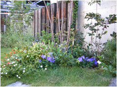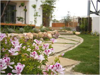 植えられている植物も種類が豊富な、住まいの白壁に緑が映えるステキなお庭に仕上がっています。ナチュラルな感じのアプローチの両脇に芝生の緑や石の間から顔を出す植物がとってもマッチしています。季節によっていろいろな花を植える楽しみも持てそうです。デッキからの階段も円形にデザインされているなど、細かな部分にもデザイン的な配慮が行き届いたガーデニングの事例です。