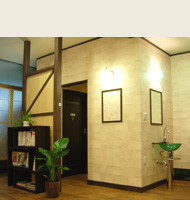 - 治療院の待合室のリフォームもさせていただきました。ダイニング同様、患者さんにも寛いでいただくことを目的とした照明と内装に仕上げました。