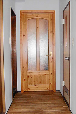 - 壁面には節のある杉板を使用。ドアはパイン材を使用することで、ログハウスの様な仕上げになりました。
