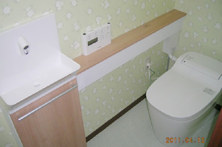 - 段差の高い和式トイレから洋式トイレへリフォームしました。スリムタイプのレストルームドレッサーには手洗いや収納、カウンターがまとまっており、省スペースで充実した機能を提供してくれます。段差もなくなり安心してゆっくりお使いいただける空間となりました。