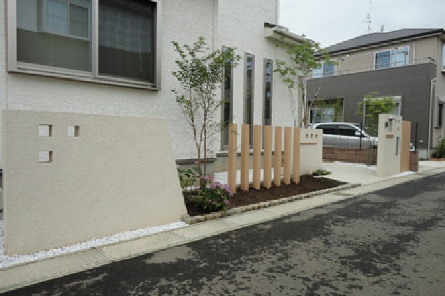 外構部分、角柱や、四角い風穴の配置間隔が、住宅部分のスリット窓の設置間隔と合わせてあるので気持ちいいですね。色合いもそろっているので住宅と外構に違和感がありません。袖壁や角柱の高さを違えたり設置位置をずらすと、視線を拡散されるので空間が広く感じられますし、見る人も楽しい気分になれそうです。セミオープンな外構は、開放感があるだけでなく、不防犯面ですぐれている部分もありますから、安心できますね。