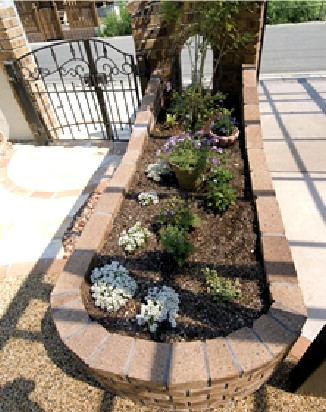 レンガ調のやさしい色合いをメインにした袖壁や、シックでエレガントな門扉が南欧風のお住まいによく合っています。カーポートの屋根や門扉や袖壁、風穴から、白い壁の扇状のコテパターンやその他細部に至るまでデザインがまとめられ、風穴から花壇へとつなげる空間の見せ方もすてきです。クローズ外構にするよりも、外からある程度見えているほうが侵入しにくいという意見もあるので、防犯面でもよい外構工事になっています。