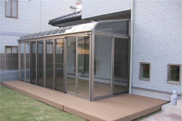 サンルームの床材を硬質系のものから人工木ウッドデッキに変えることで、小さなお子様が裸足で走りまわったり、寝転んだりしても安心な、汚れを気にせず伸びのびと遊ばせられる空間になりました。椅子やテーブルを置けば、外の空気を感じながらお茶をしたりお酒を飲んだり、離れ的空間として使う楽しみもあります。アプローチのルーフはお家の外観を損なわず最初からあるかのように思えるほどマッチしています。