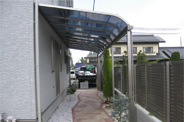 - 「ほせるんです」を提案し室内空間を有効利用しました。小さなお子様がいらっしゃるので、当初のプランであったコンクリート&タイルの床仕上りから人工木ウッドデッキへの変更を提案しました。テラス(アプローチ屋根)=敷地の門(北側)から玄関(南側)への移動通路にルーフを付ける事で雨の日も濡れずに門から玄関まで移動できるようにアーチ(テラス)を取付ました。
