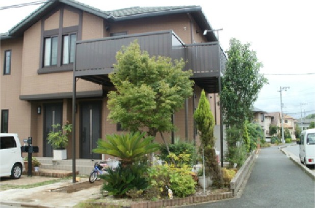 - 車庫の1台分を利用して大型のベランダを取付けました。2階台所の窓が小さくて風の通りが悪いため、採風タイプの勝手口ドアに変更し、ベランダへの出入口に用途を変更しました。また、建物の側面に大型ベランダと連続したかたちで、物干し専用のベランダも設置しました。