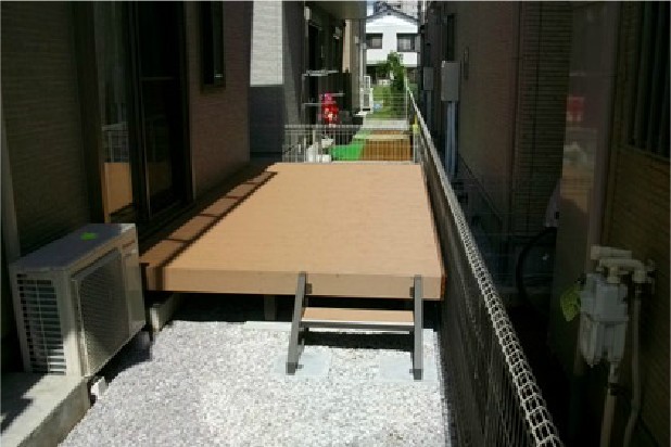 - 新築を購入し砂利を敷詰めた庭に、ウッドデッキを設置しイメージを一新し、リビングと庭との生活空間を広く使いたいとのご依頼でした。リビングのサッシと庭との段差が高かったため庭に出るのに玄関から廻ってでていたそうです。ウッドデッキ完成後は、庭にでるのも駐車場に行くのもリビングからウッドデッキを通ってがほとんどになり、すっかり生活動線が変わってしまったと、お喜びいただけました。
