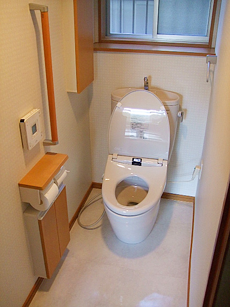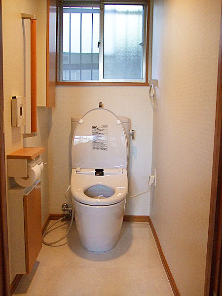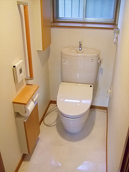 - お手入れのしにくかったタイル貼りのトイレをお手入れしやすいようにリフォームしました。収納については、埋め込み収納を設けたことでスペースを有効活用しながら、使い勝手のよいトイレになるように提案しました。床と敷居との間のいやな段差をなくしバリアフリーにしています。また、手すりを取り付けて立ち座りをスムーズにしていただけるようにしました。