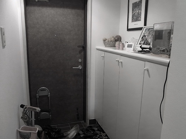 フロアタイル張替え、収納棚を一新して玄関のイメージをガラリと変えました。