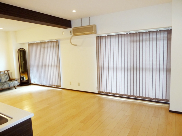 | リフォーム内容 | 3LDK(和室二部屋含)を、1LDKと寝室に間取変更しました。 広々としたLDKは、あえて梁をそのまま見せることで出来るだけ天井を高くして、開放感を感じられるようにしました。全体的に明るい内装に、ブラウンの建具で引き締めています。 |