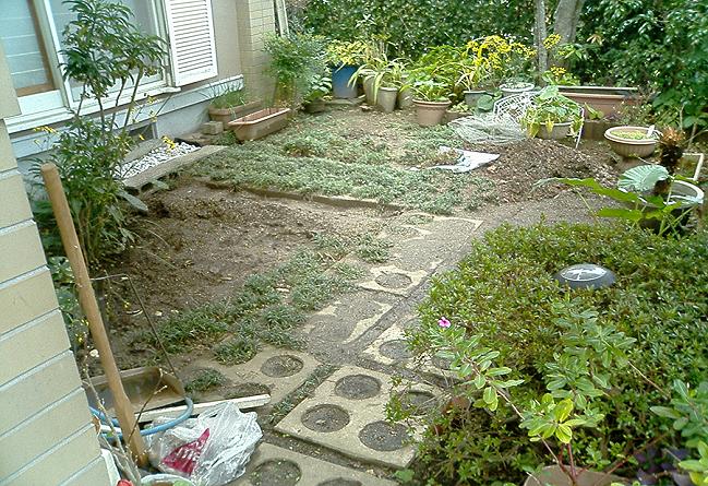 - 水はけの悪さを解決するために思い切ってお庭全体を改装させていただきました。頻繁に移動される箇所は歩きやすいように乱形石でしっかりと舗装、それ以外は水はけを考えて砂利敷きとし、途中途中に飛び石を配置しました。飛石の位置は奥様の歩幅の間隔で調整しています。