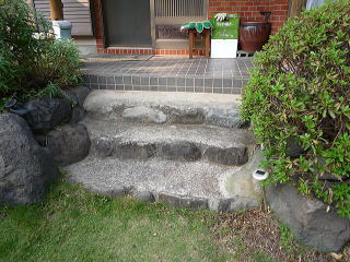 雨などで濡れた階段は健康な人でも滑ることがありますから、足腰の弱い方や年配の方であればなおさら危険です。ご家族のために手すりを設けられるというやさしい気持ちの感じられるご依頼で、素敵ですね。丸みを帯びたデザインもお庭のイメージにもぴったり合っているように感じます。しっかりと支柱を立てて、使いやすい角度に調整して設置されたそうですので安心してストレスなく使うことができそうですね。