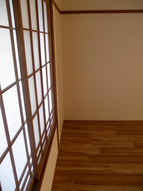 - 居室は、床の下地が腐り、畳ごと下がり始めていましたので、先ずは、畳の下のコンパネの貼り換えを致しまして、その後、リノベーションに多用されている木目柄塩ビタイルを施工致しました。壁は真壁(柱や木部の見えている和風のスタイル)の木部を残して、クロス下地用にベニヤを貼った後、珪藻土風のクロスを施工致しました。