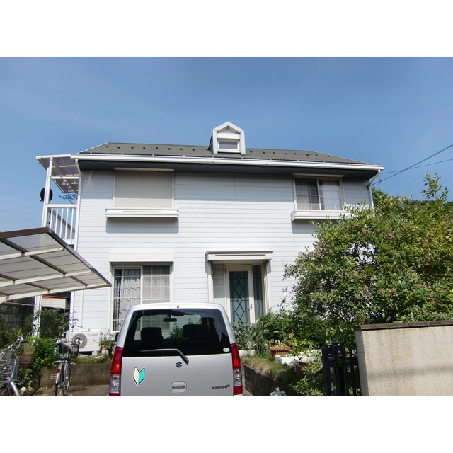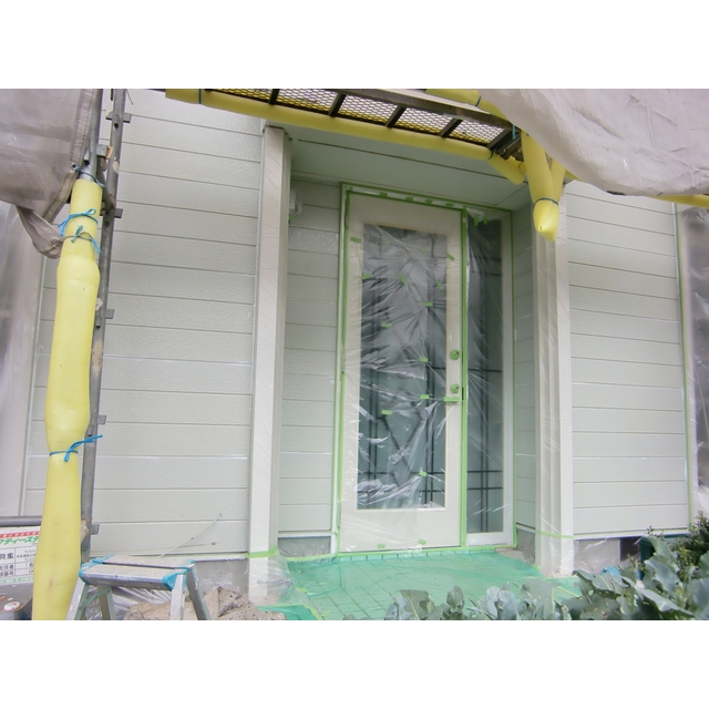 断熱塗料による、屋根・外壁の塗装事例。ガイナは、断熱・遮熱性能において優れた効果を発揮する、セラミック配合の断熱塗料。外壁や屋根の温度変化を防ぎ、住まい自体を守ります。外壁は、非塗装部分を養生して保護し、破損部分の補修の後、明るいグリーンに塗装。屋根は破損部分の補修と高圧洗浄の後で塗装しました。バルコニーにはテラス屋根を付け、雨の日でも洗濯物が干せる貴重なスペースに。家事の効率も上がりそうです。