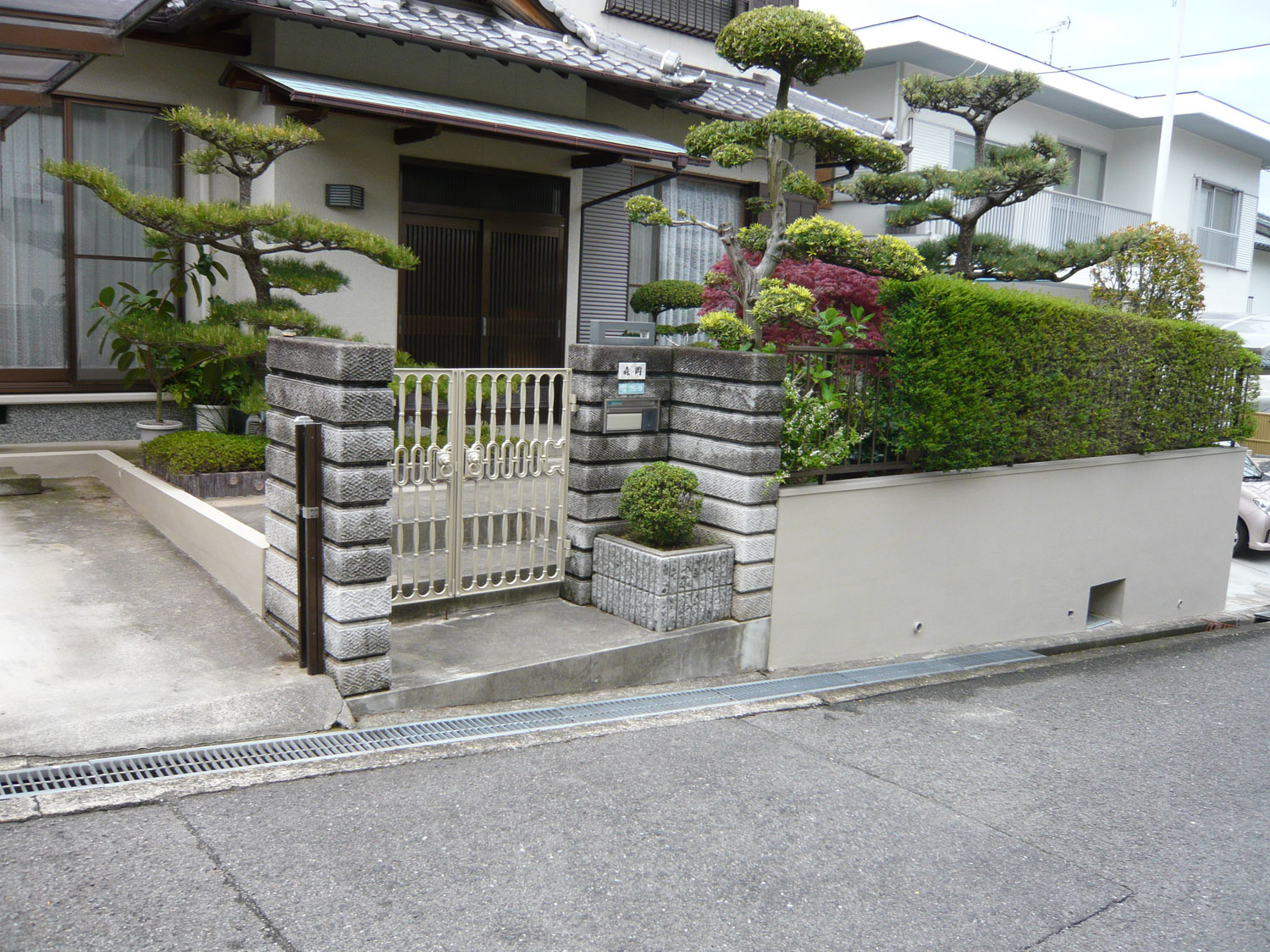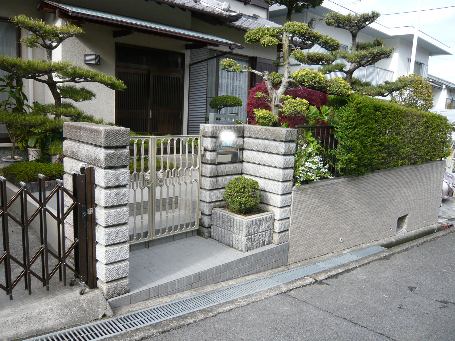 - 塗装をはがし、下地補修をしタイルを張り付けました。また門扉の塗装も施し
