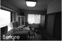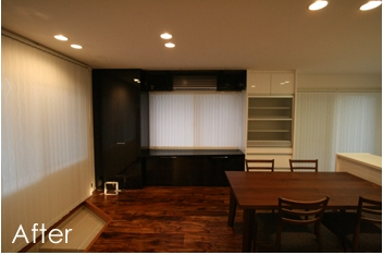 - 既製品の食器棚と奥行きの違う変形カウンターのあるクローゼットを溶け込ませています。