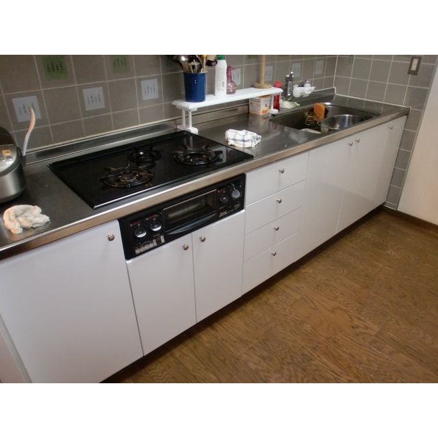 | 使用した住設機器・資材等 | 新しい洗面化粧台と同じ色の特殊シートをキッチンに施工した。 | ||