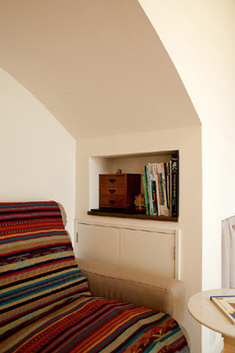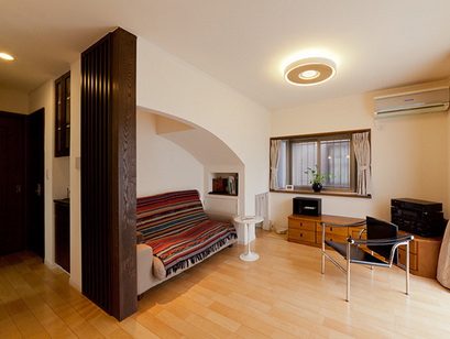 - 階段下ソファースペースは天井の低さが逆に寛げる「こもれる」スペース。ご近所のカフェにヒントに天井をアールデザインにしました。