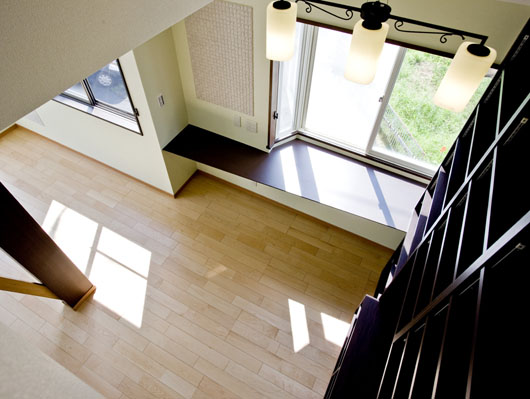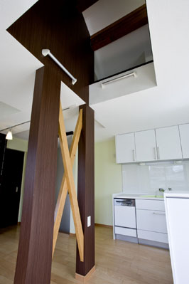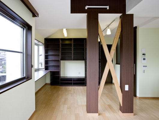 - 1・2階逆転プランで明るく広々したLDKに生まれ変わりました。間取り変更に伴ない柱を抜いた分、筋交いなどで必要な耐震補強を施しました。柱+筋かい補強はLDKデザインアクセントに。