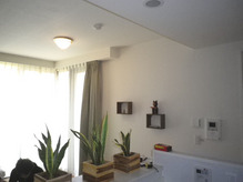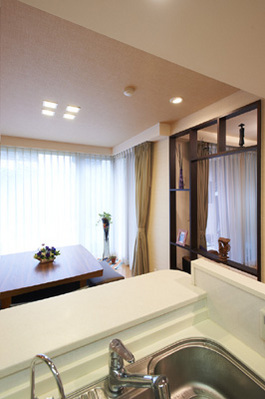 - リビングからソファの背面飾り格子越しに、ちょうどダイニングのアクセント壁が見えます。