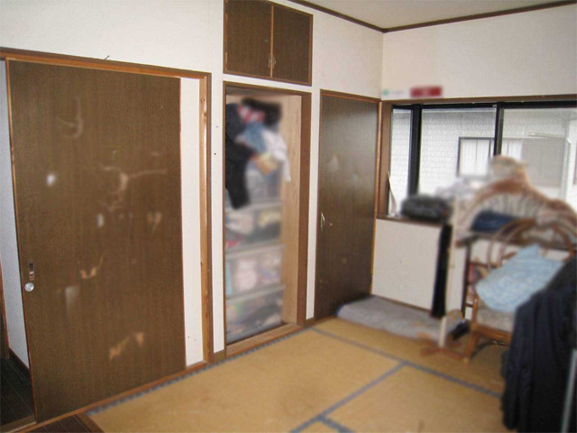| リフォーム内容 | 床上げ工事…床を畳からフローリングへ変更 建具工事…出入り口引き戸・収納の片開き戸・天袋観音開き戸の3箇所 建具枠の塗装(内装用のウレタン塗装) 内装リフォーム…天井・壁のクロス張り替え工事 |