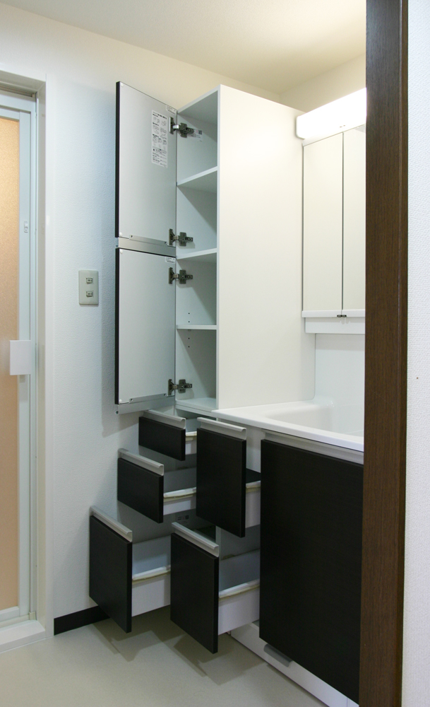 - 収納部分がたくさん欲しいとのご希望で、収納+洗面化粧台を設置しました。内装は白を基調としました。