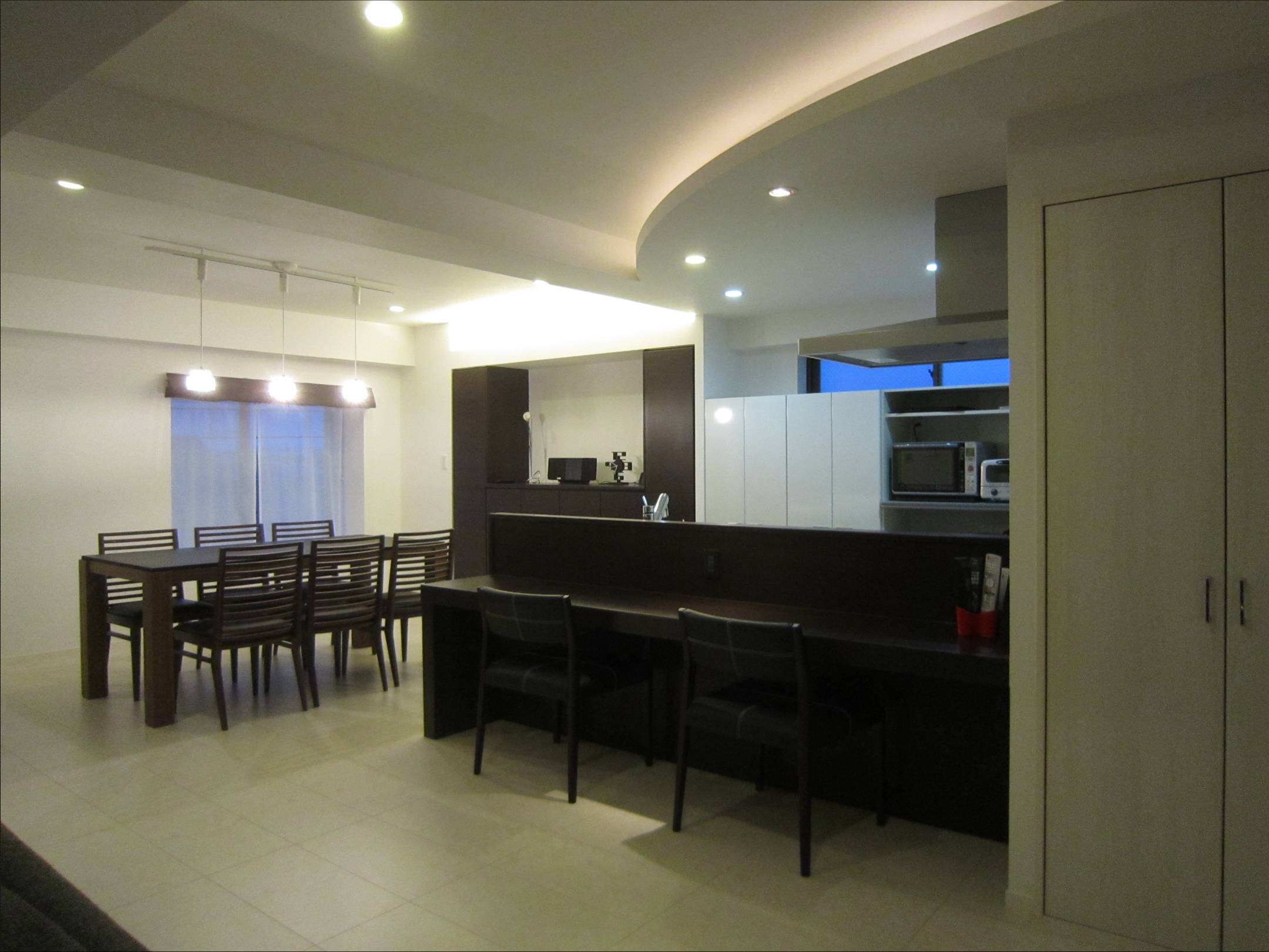 | リフォーム内容 | 広いLDKをただ広げるだけでは空間がぼやけてしまうので、2色のフローリングを張り分けてリビングとダイニングのそれぞれの空間にメリハリをつけました。 キッチン上部のアールの間接照明で、リズミカルなLDKになりました。 |
