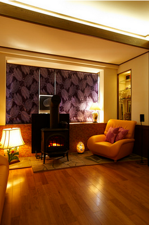 開口がとても大きくてお庭の眺めもよく、折り上げ天井に設置した間接照明による空間演出が、薪ストーブを使った暖炉もリビングによくマッチしています。広いリビングなので薪ストーブだけでは寒い夜もあるかもしれませんが床暖房の兼用ができるので安心ですね。オレンジと紫の配色もとても素敵ですね。あたたかな配色と暖炉、床暖房の暖かさで、身も心もあたたまる素晴らしいリビングになっています。