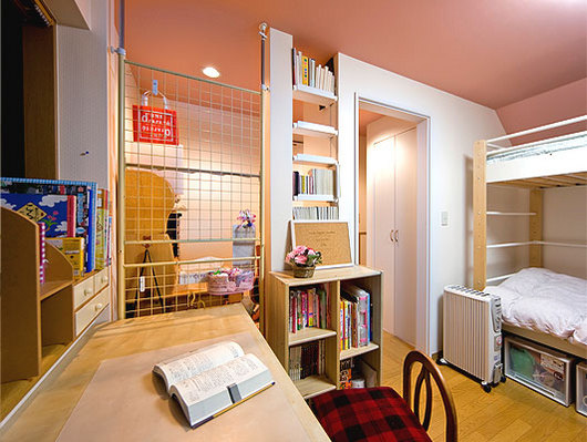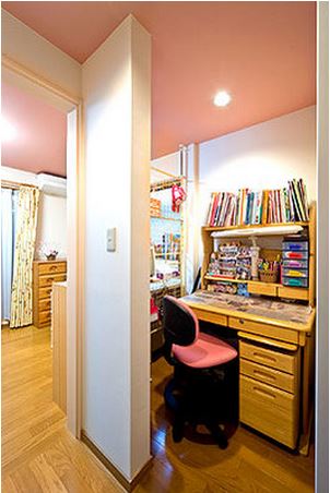 - 天井には姉妹のイメージにぴったりなピンク色をセレクト。 お部屋のアクセントになりました。入口は廊下のスペースを取り込み、使い勝手を考え片引き戸を設置しました。物入から子供部屋スペースに一新した部分には妹様の机を設置。机と机の間はあえて壁は造らず、家具で仕切るようご提案いたしました。 構造上残した柱は可動棚として有効利用しました。