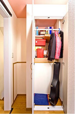 構造上抜けない柱は壁との空間に可動棚を設置しました