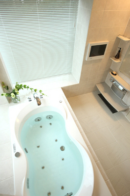 - お庭が良く見えるように、また自然光を十分に取り入れ明るい浴室となるように、コーナー窓の柱を補強し、さらに大きな窓を設けました。以前の浴槽よりも格段に大きなジェットバスをお勧めし、ゆったりくつろいでいただけるようにしています。最新設備のTV、浴室暖房乾燥機「MISTY」、電気サウナを採用しました。