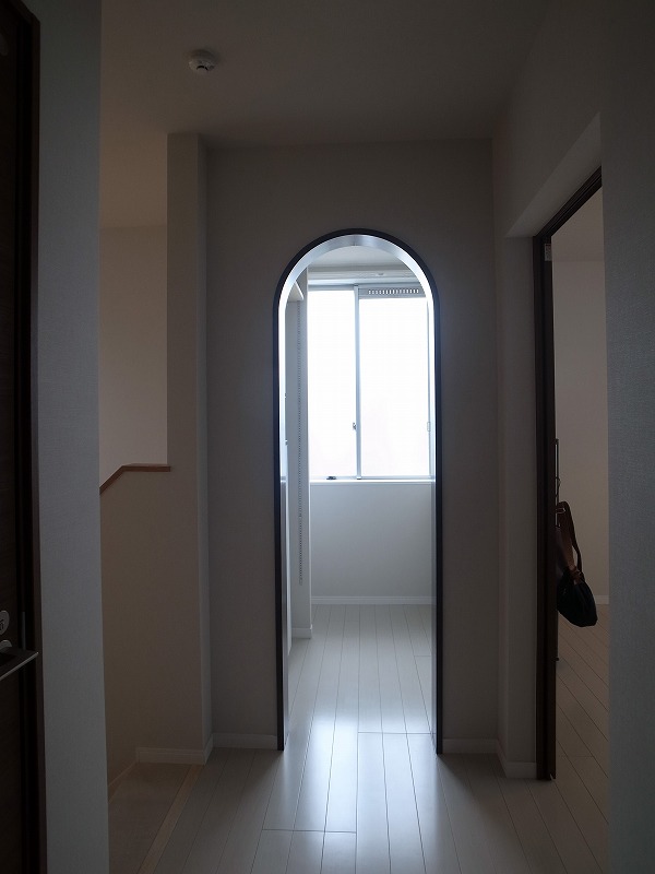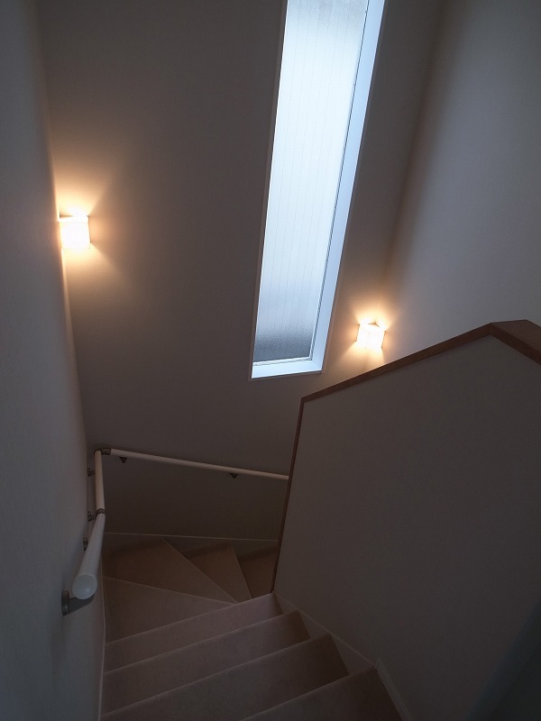 - 1Fと2Fに色の違う床材をつなぐ階段には、遭えてカーペットを使いました。柔らかな雰囲気の階段スペースの完成です!