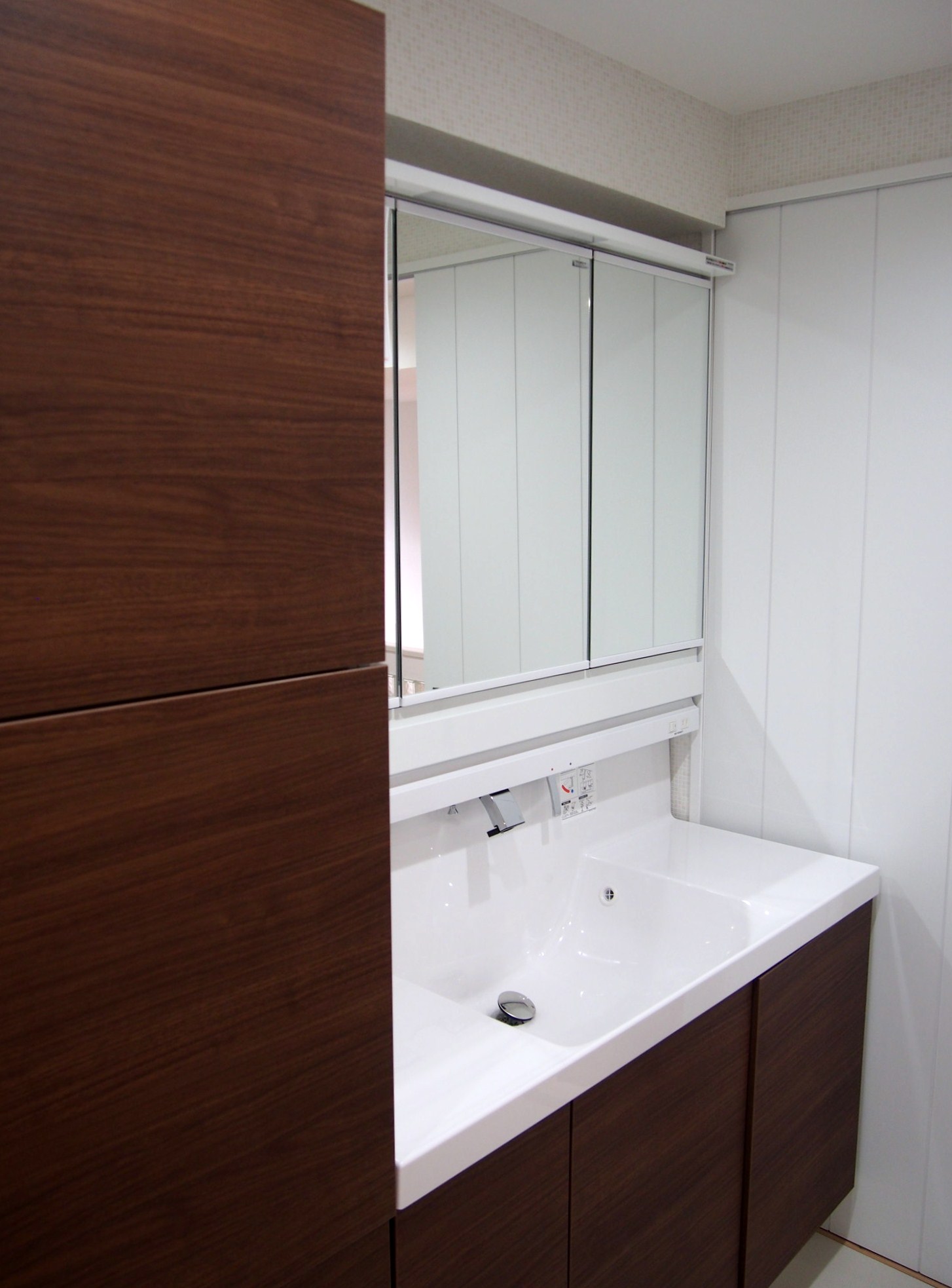 - 浴室のサイズを小さくして洗面室を広く取り、洗面台と同じシリーズのトール収納も設置いたしました。