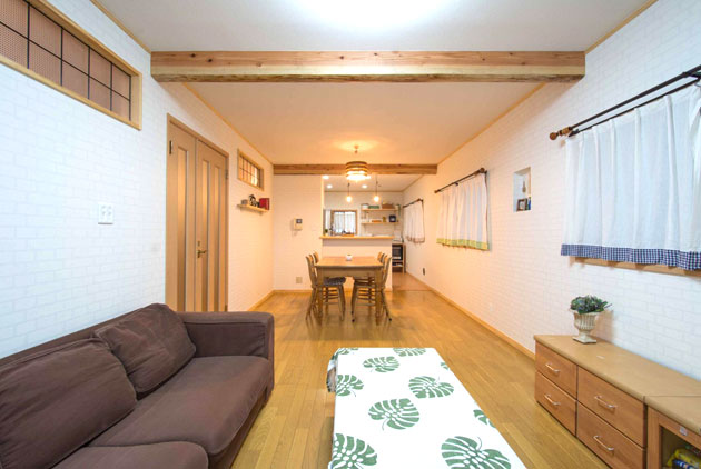 天井には2か所に杉太鼓梁を施し、ダイナミックな印象のインテリアを演出。インテリアのアクセントとなり、奥行きを感じさせつつも間延び感が無くなりました。