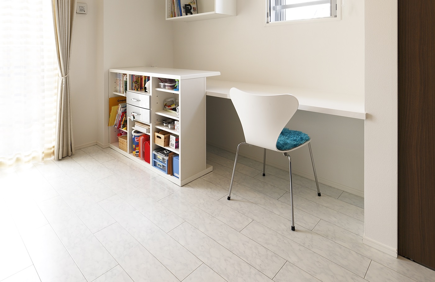 引き出し収納付きのカウンターデスクと本棚も造り付けました。