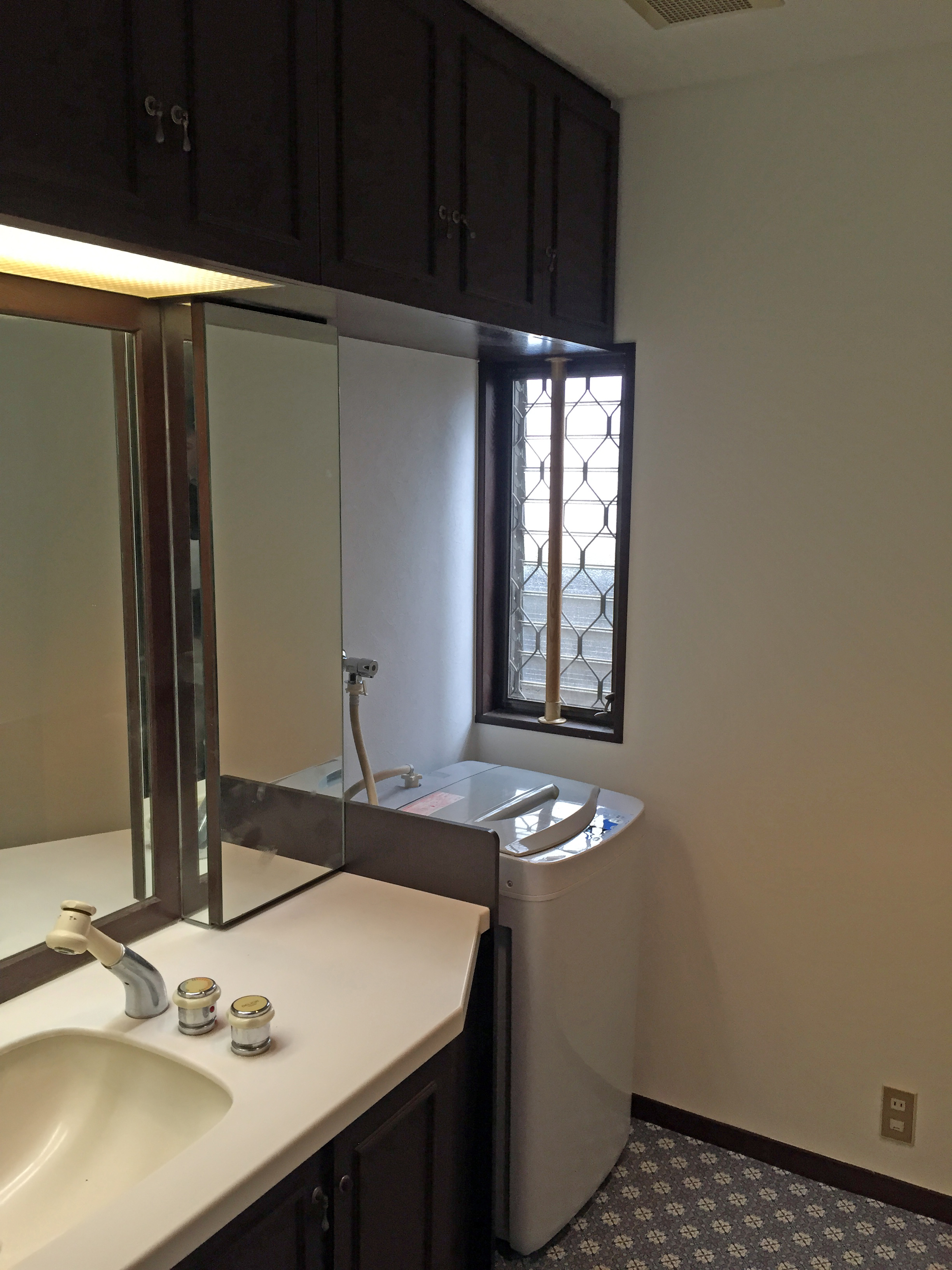 - 壁から壁まである、広い洗面台は素敵だったのですが、そこまでの広さは必要ないという事で、天板をカットしサイドパネルでおさめました。空いたスペースは洗濯機置き場として有効利用し、もともと洗濯機置き場だったキッチン横は、棚を造作してパントリーとして活用。水廻りの使い勝手が向上しました。