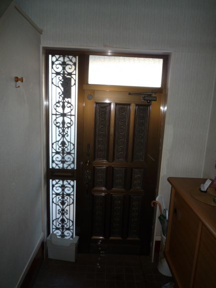 - 玄関内装・収納設置・照明交換・玄関ドア交換・木部塗装をしました。