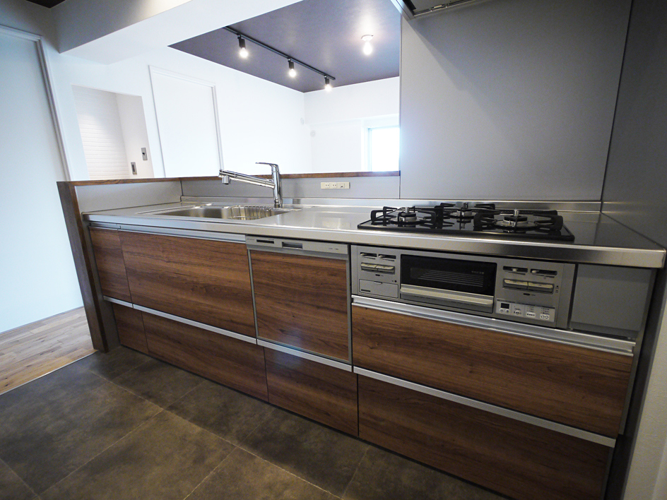 ヴィンテージカウンターと同じ色調のキッチンには、食洗器も搭載