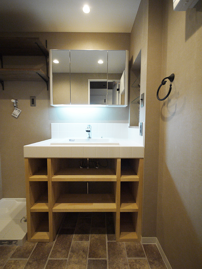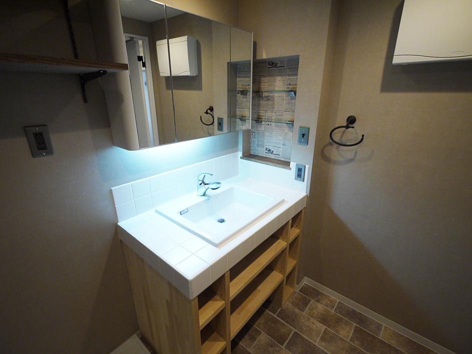エレガントな白タイルの洗面台。下部収納は造作したオリジナル