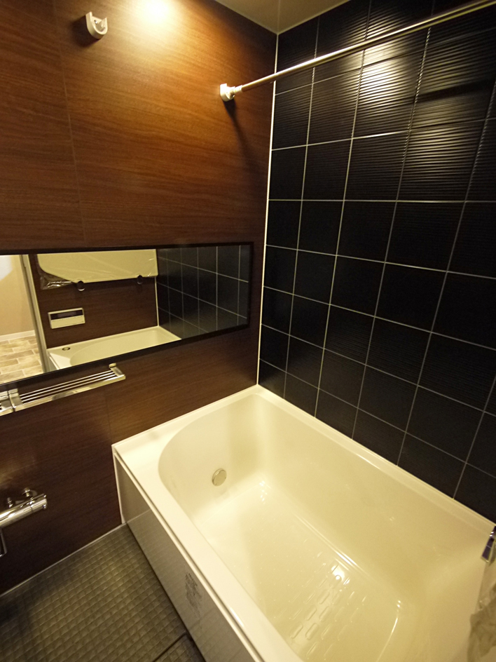 黒タイルとウッディー調パネルで高級ホテルの浴室のように