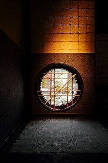 円窓に取り付けた格子に、以前使用していた障子の桟を再利用。