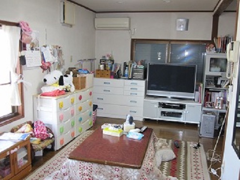 - 空間を塞いでいた家具を全て取り払い、リビングのスペースを大きく広げました。壁を白色に統一することで、空間に広がりを感じられる上に、窓からの光を効率よく部屋に取り入れる事が出来ます。テレビ台横に設置した壁面収納棚”キュビオス”で、溢れていた物をコンパクトに収納。快適に寛げる明るいリビングになりました。